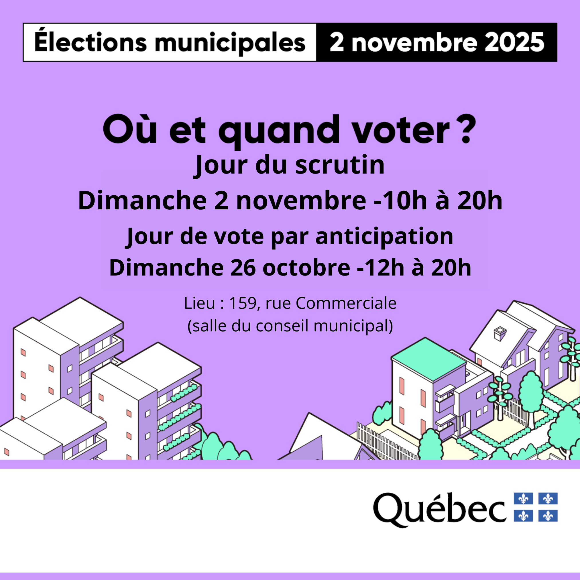 - Le recensement des votes aura lieu le 2 novembre 2025 à 21 h 15 à l’adresse suivante : 159 rue Commerciale. Vous pouvez y assister.