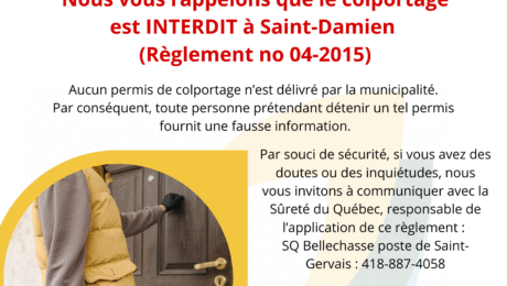 Nous rappelons que le colportage est strictement interdit sur le territoire de Saint-Damien, conformément au Règlement no 04-2015.