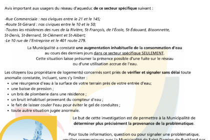 La Municipalité a constaté une augmentation inhabituelle de la consommation d’eau au cours des derniers jours dans ce secteur spécifique SEULEMENT.