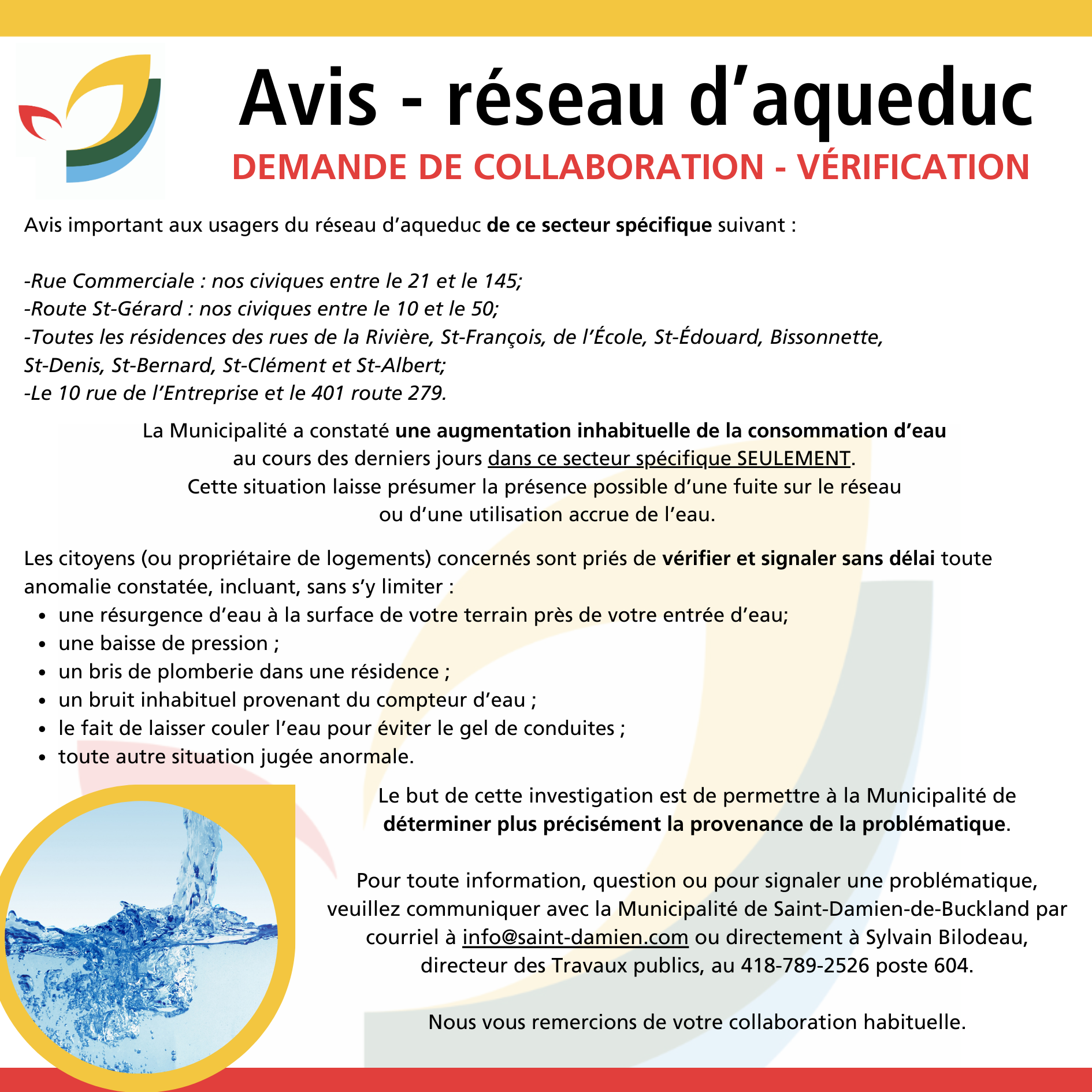 Pour toute information, question ou pour signaler une problématique, veuillez communiquer avec la Municipalité de Saint-Damien-de-Buckland par courriel à info@saint-damien.com ou directement à Sylvain Bilodeau, directeur des Travaux publics au 418-789-2526 poste 604.